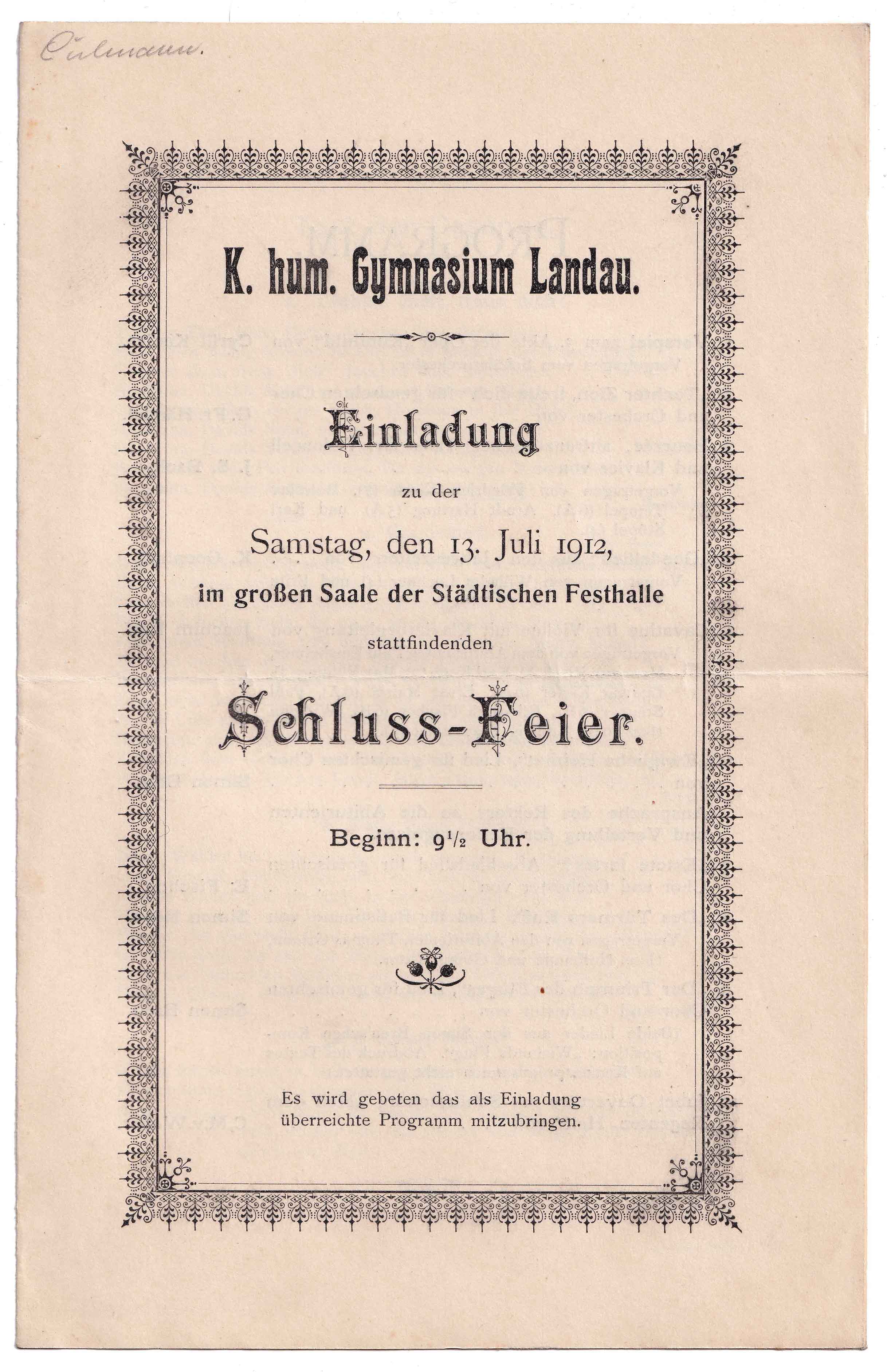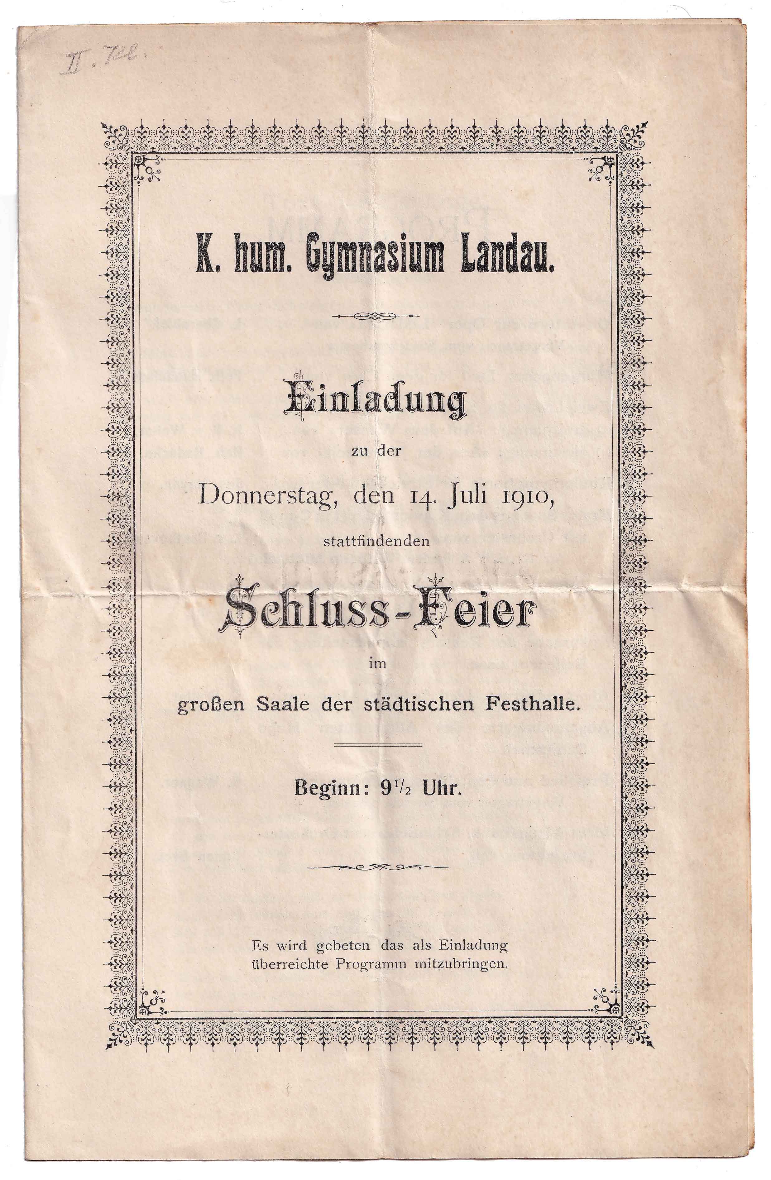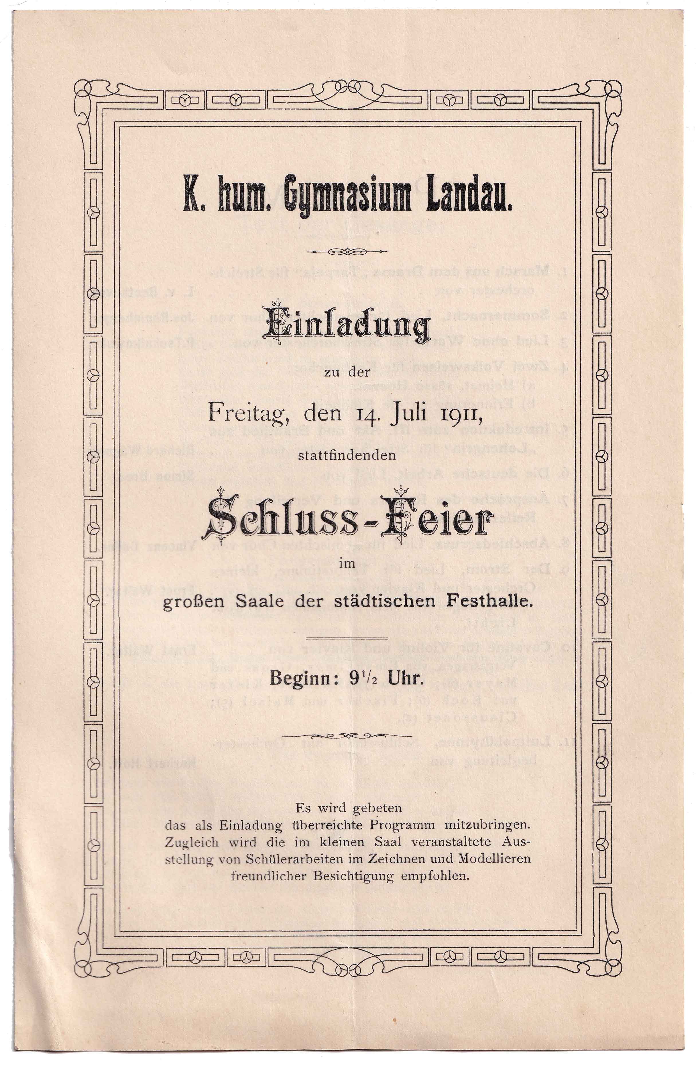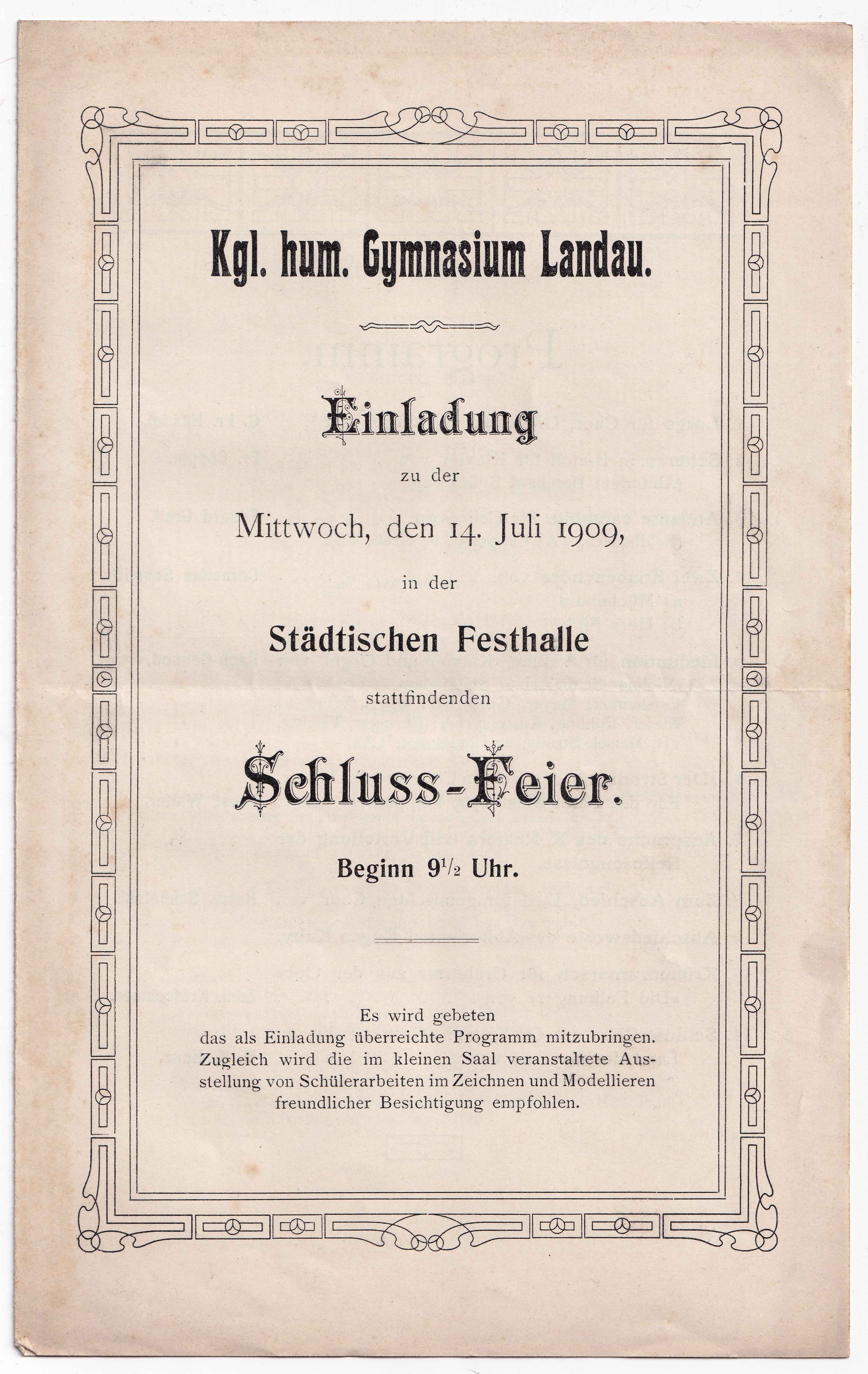 Einladung zur Schluss-Feier im großen Saale der Städtischen Festhalle