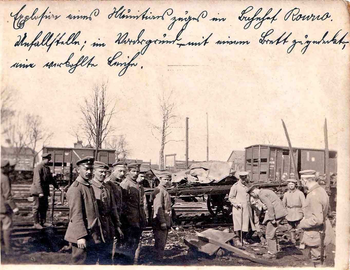 "Verwüstung im Bahnhof Rowno, hervorgerufen durch verbrennen und explodieren eines Munitionszuges."