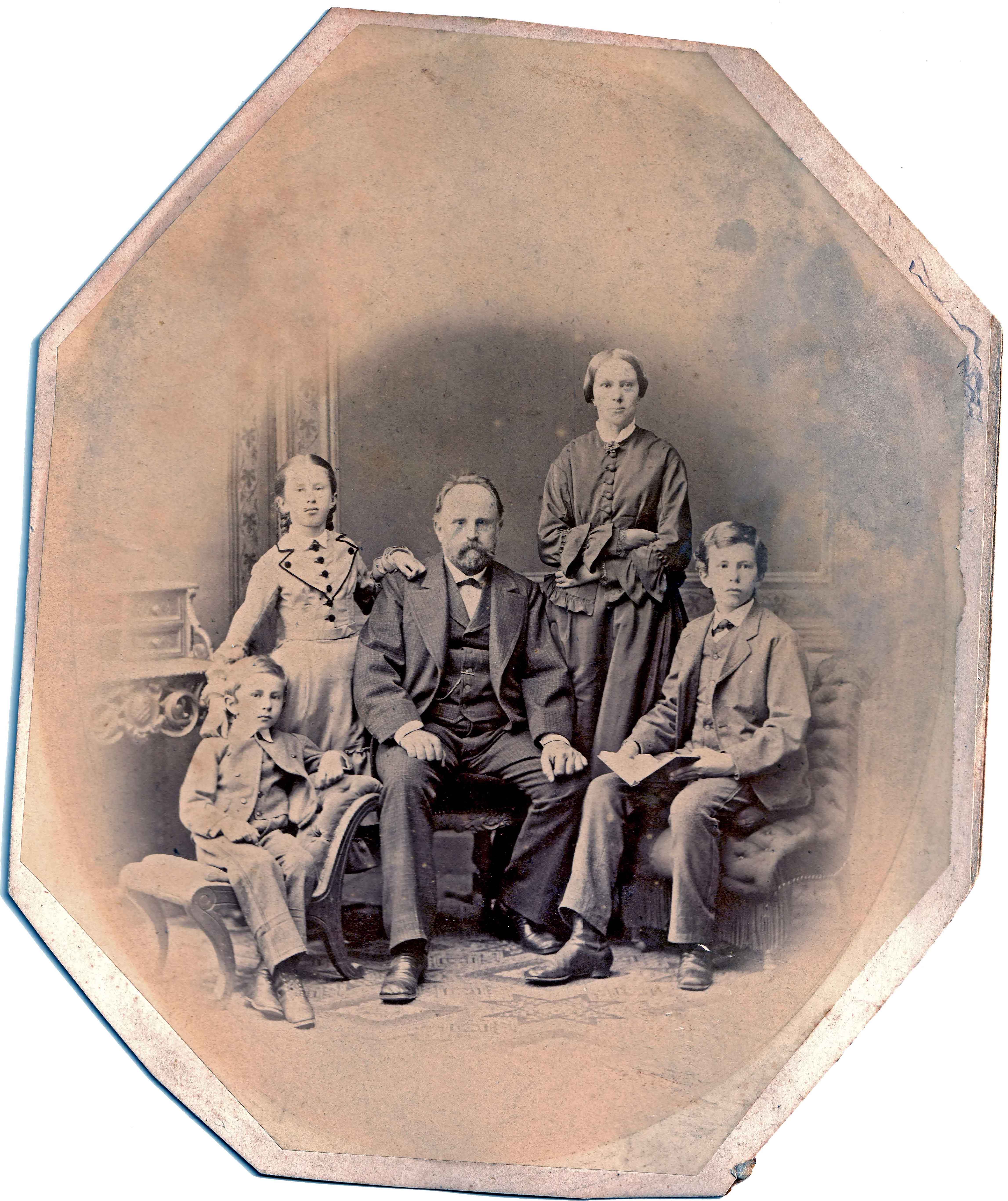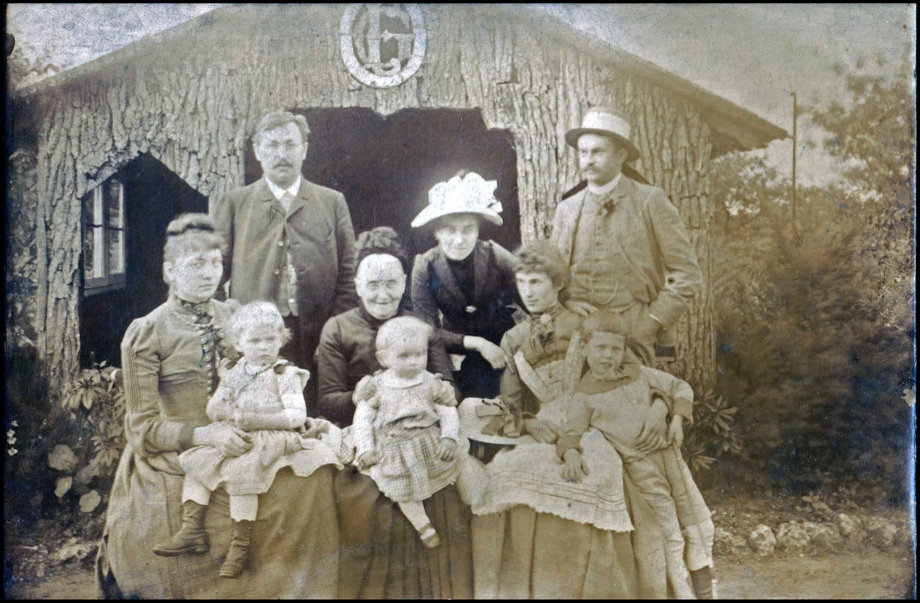 ![]() von Links stehend: Georg Ludwig Fitz - Maria Elisabeth Schranck - Karl Friedrich Fitz von Links sitzend: Emilie Deibel (Frau von Georg) - Susanna Elisabeth Schranck - Marie Fitz von Links Kinder: Hermann Fitz - Liui Fitz - Walter Fitz Im Garten von Verwandten Fitz in Ellerstadt |